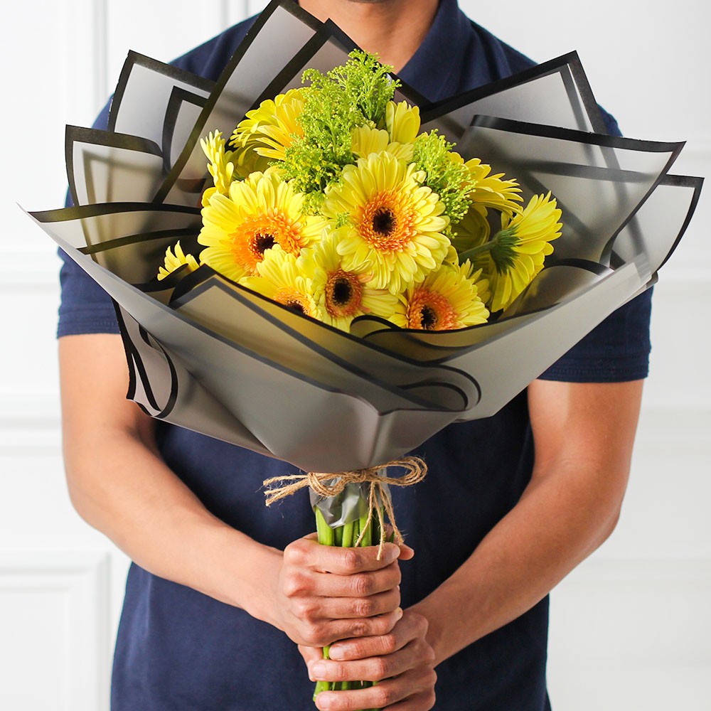 باقة مكونة من 20 وردة جربيرا لون اصفر مع بعض الخضارات.