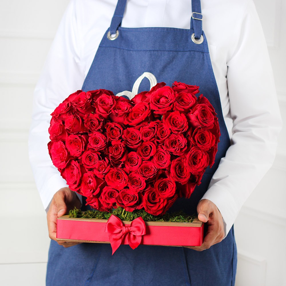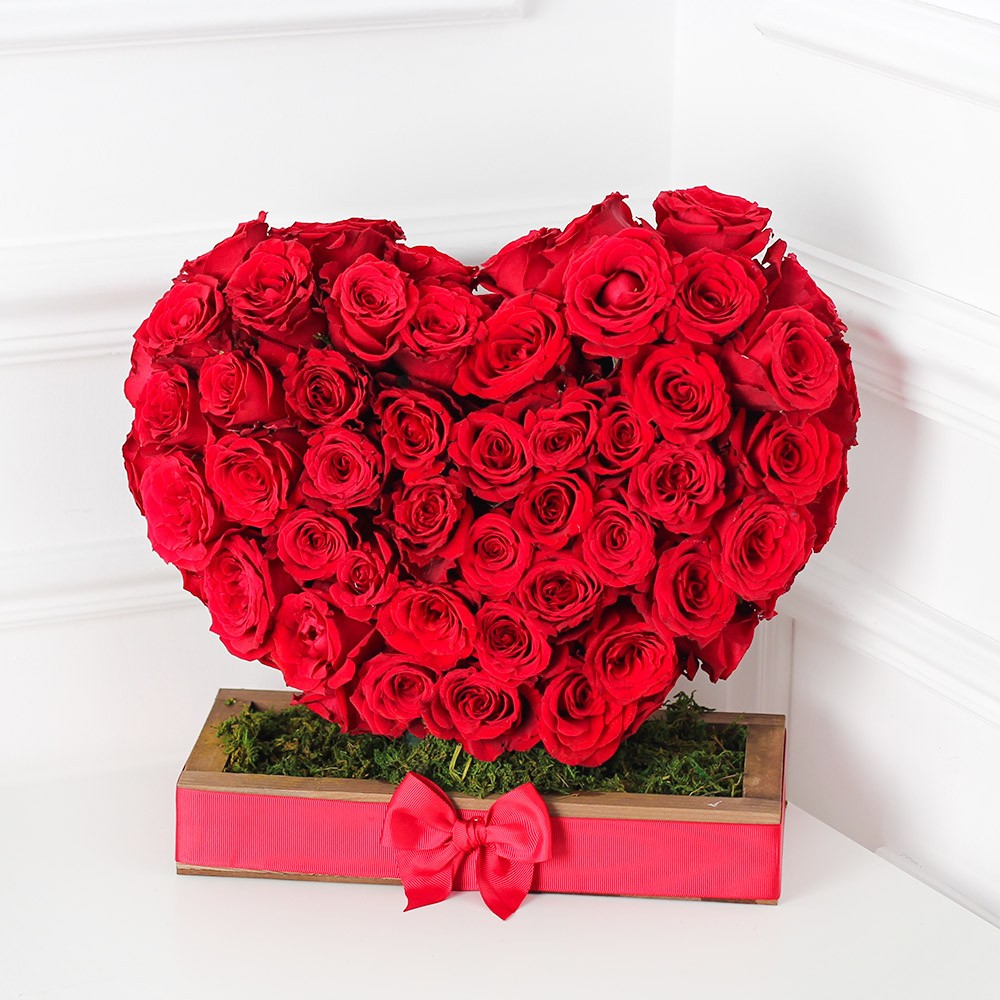 باقة ورد بشكل قلب نابض على قاعدة خشبية مكونه من 70 وردة جوري احمر.