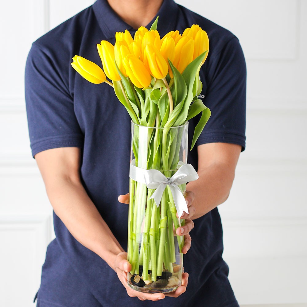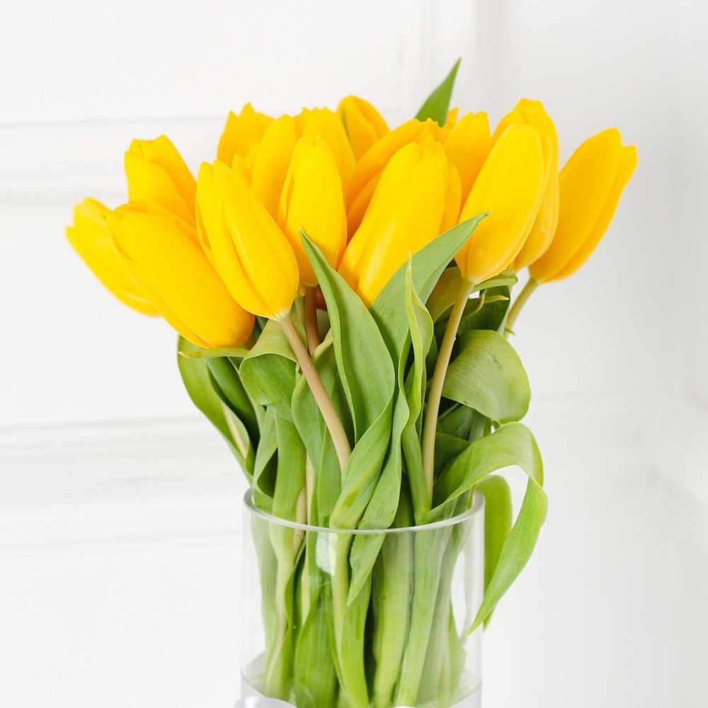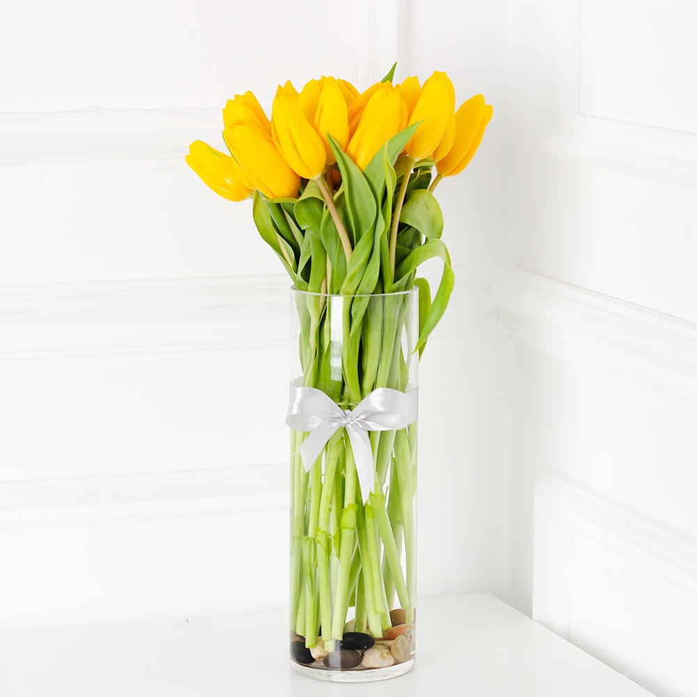 فازة مكونة من 20 وردة توليب لون اصفر.