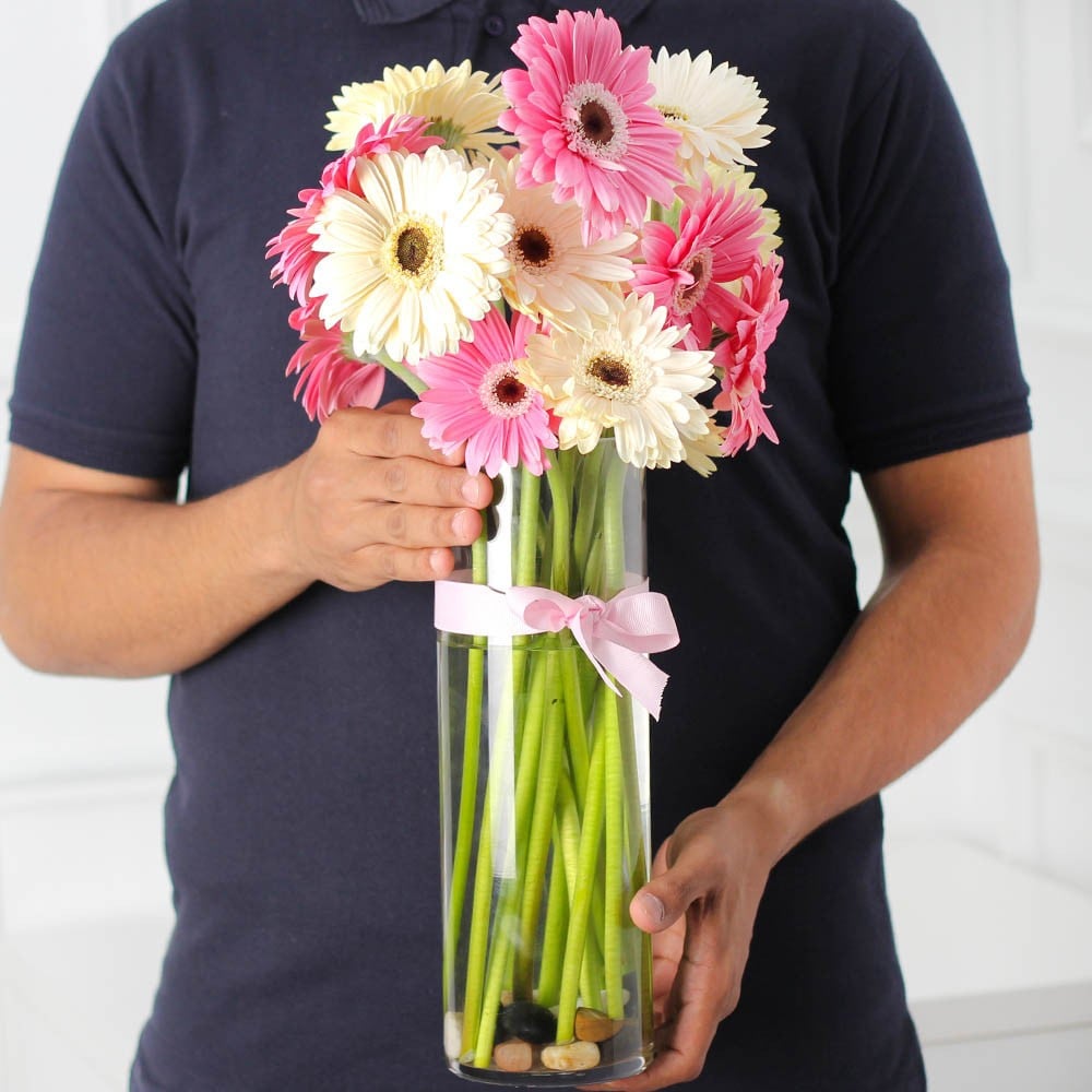 فازة مكونة من 20 وردة جربيرا لون ابيض ووردي.