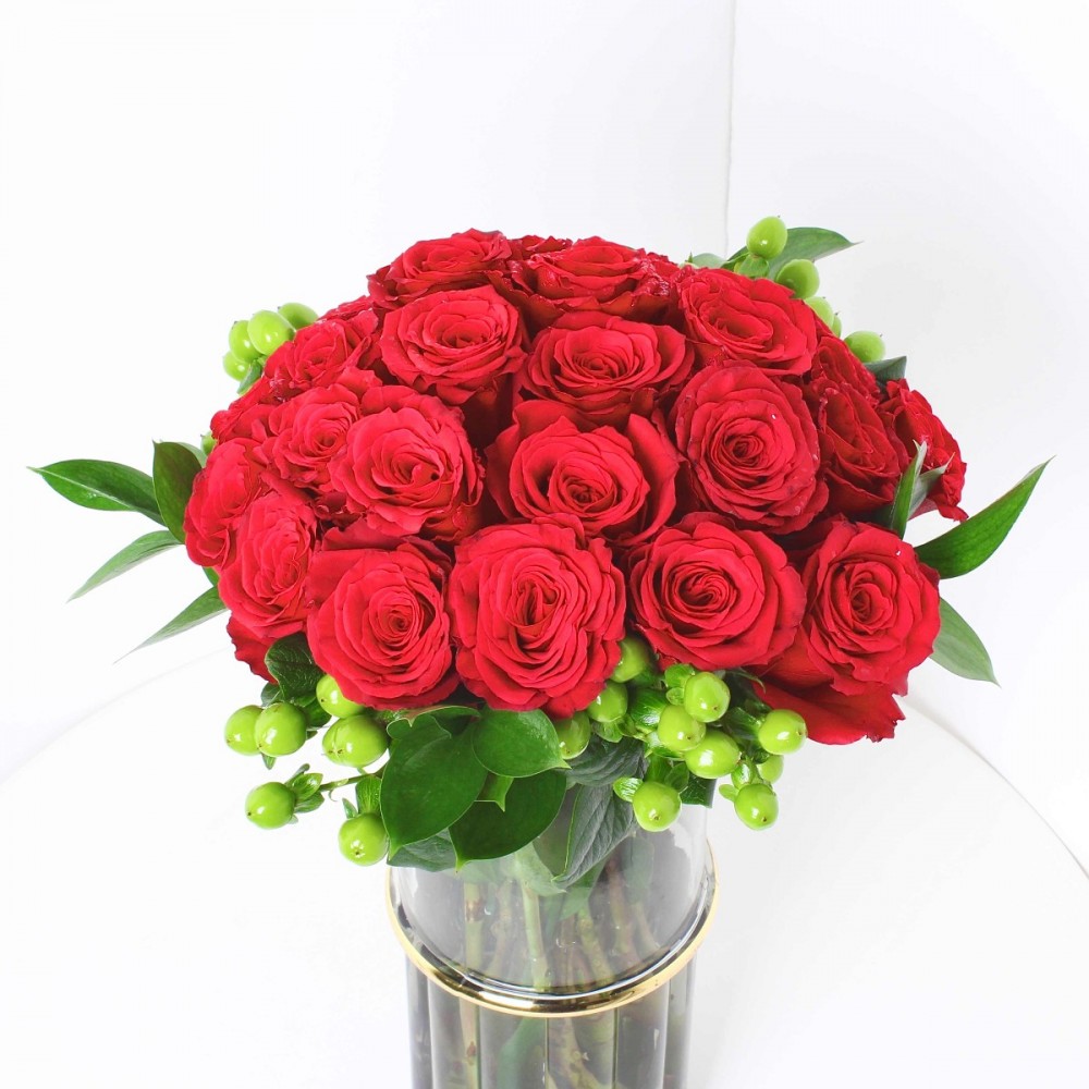 فازة مكونة من 20 وردة جوري باللون الاحمر مع بعض الاكسسورات.
