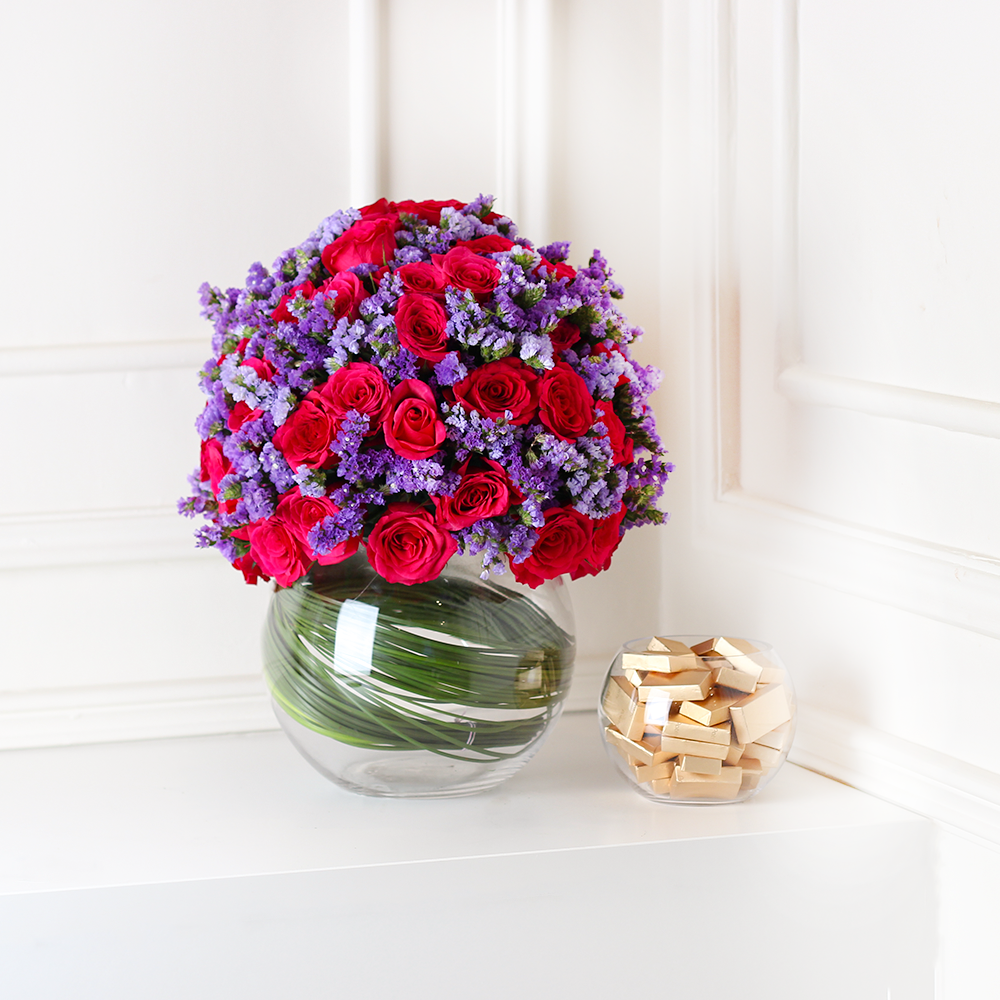 فازة مكونة من 70 وردة جوري لون فوشي مع استاتوس، تقدم الفازه مع شوكولاته من باتشي - 750 غرام -.