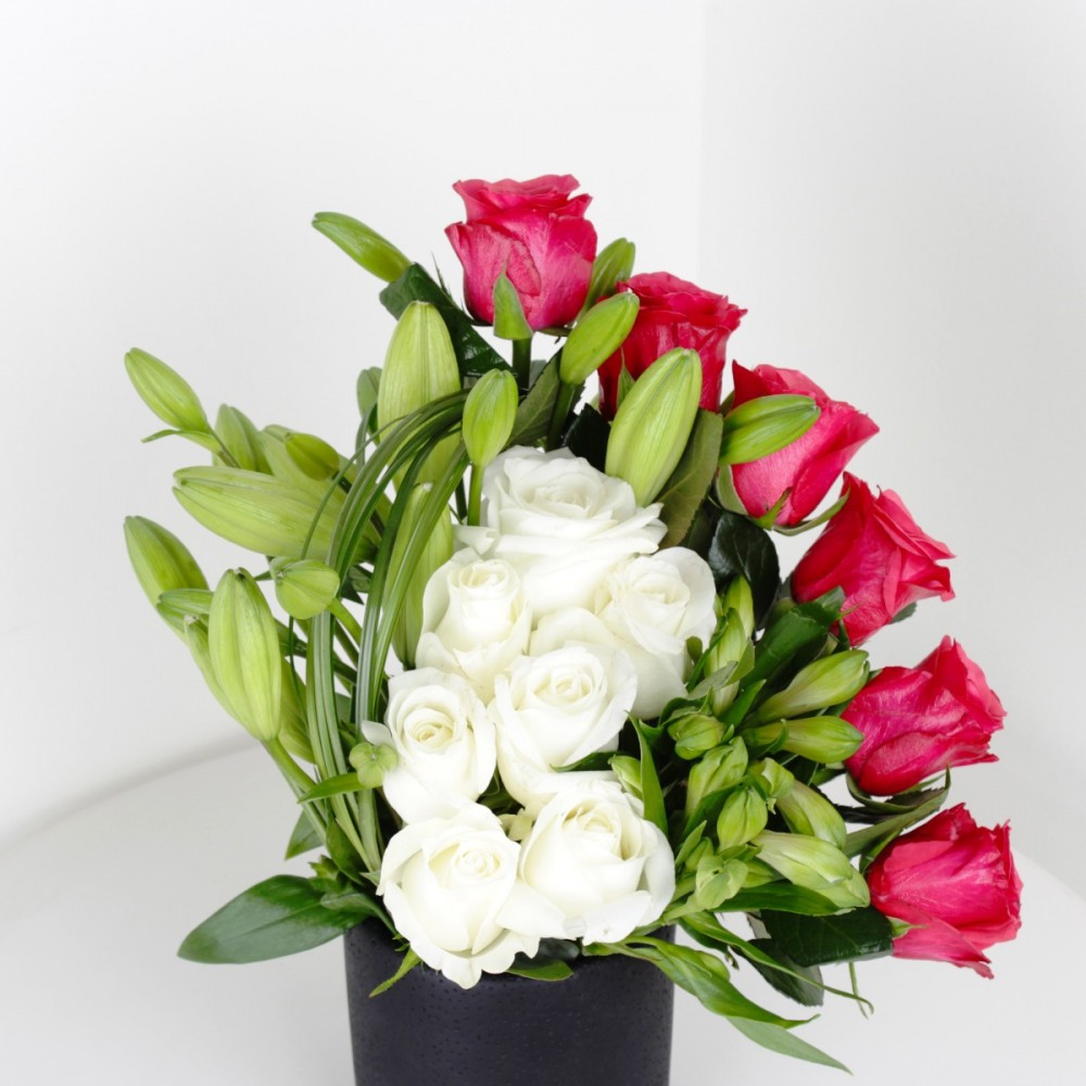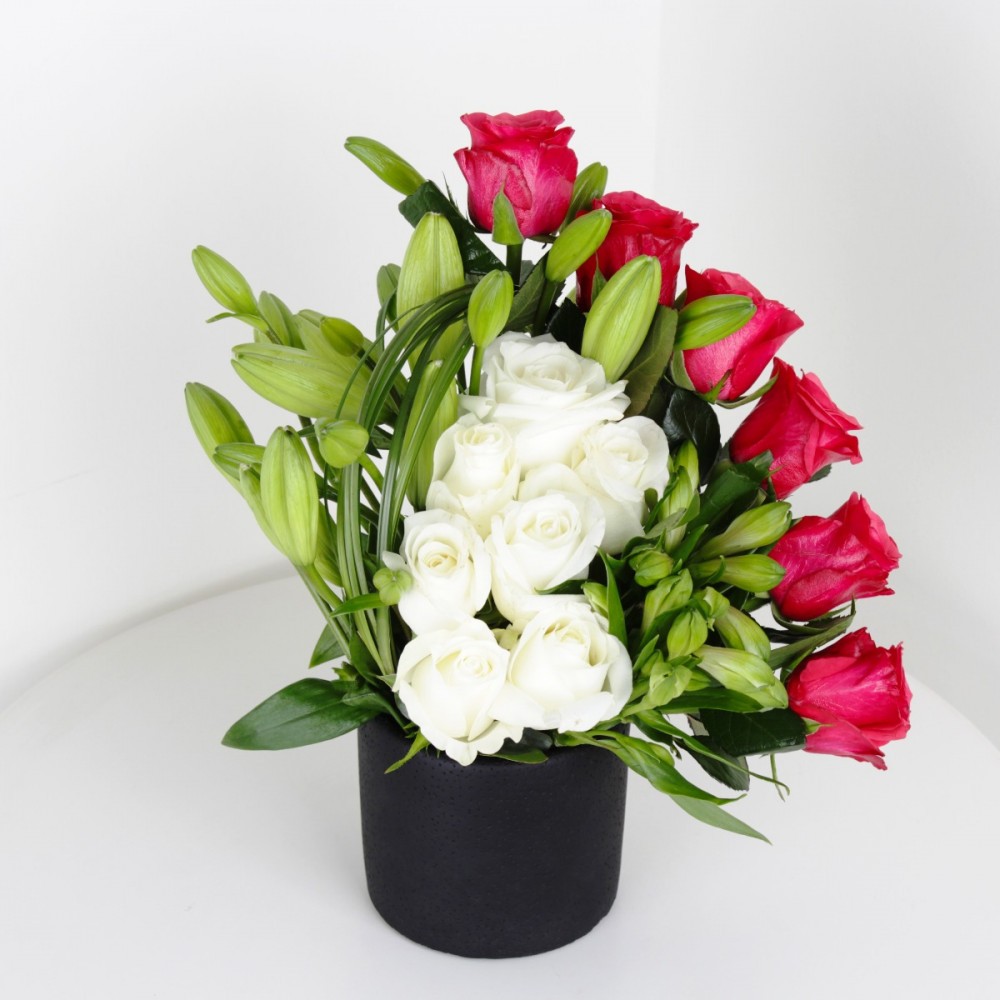 فازة مكونة من 9 روز فوشي و ابيض, 2 عود استروميريا، 2 عود ليليوم ابيض و عود استاركوس.