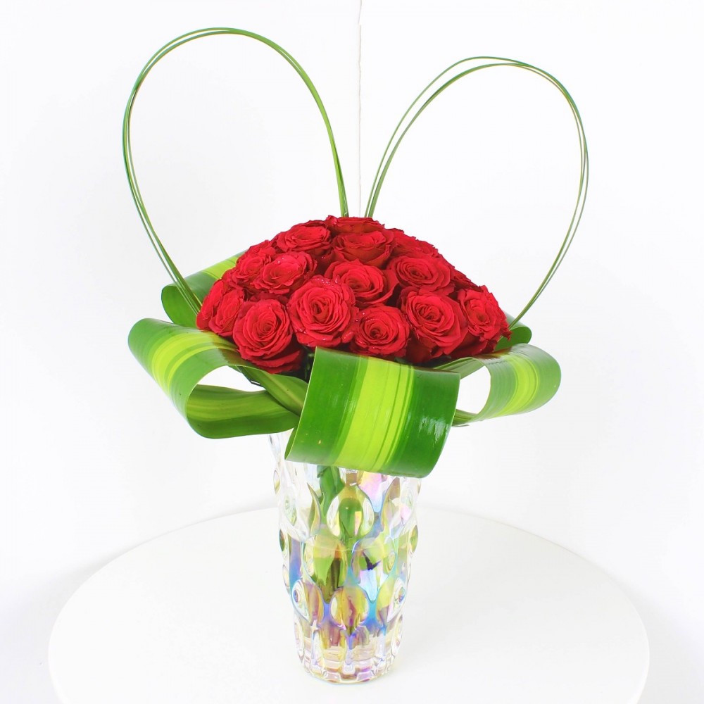 فازة مكونة من 30 وردة جوري باللون الاحمر مع بعض الاكسسورات.