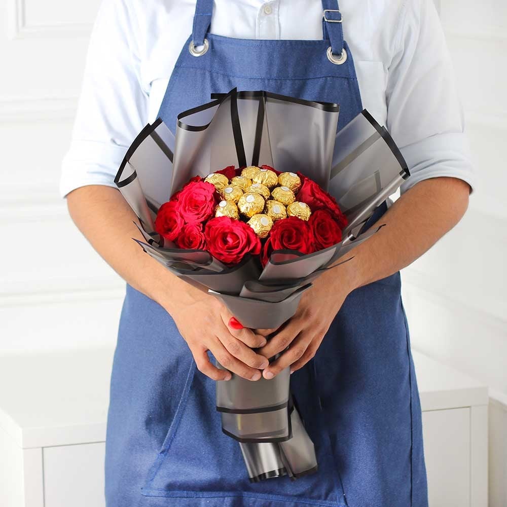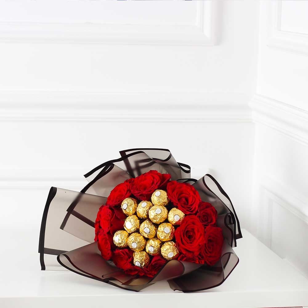 A bouquet of 12 red roses and 16 Ferrero Rocher chocolates.